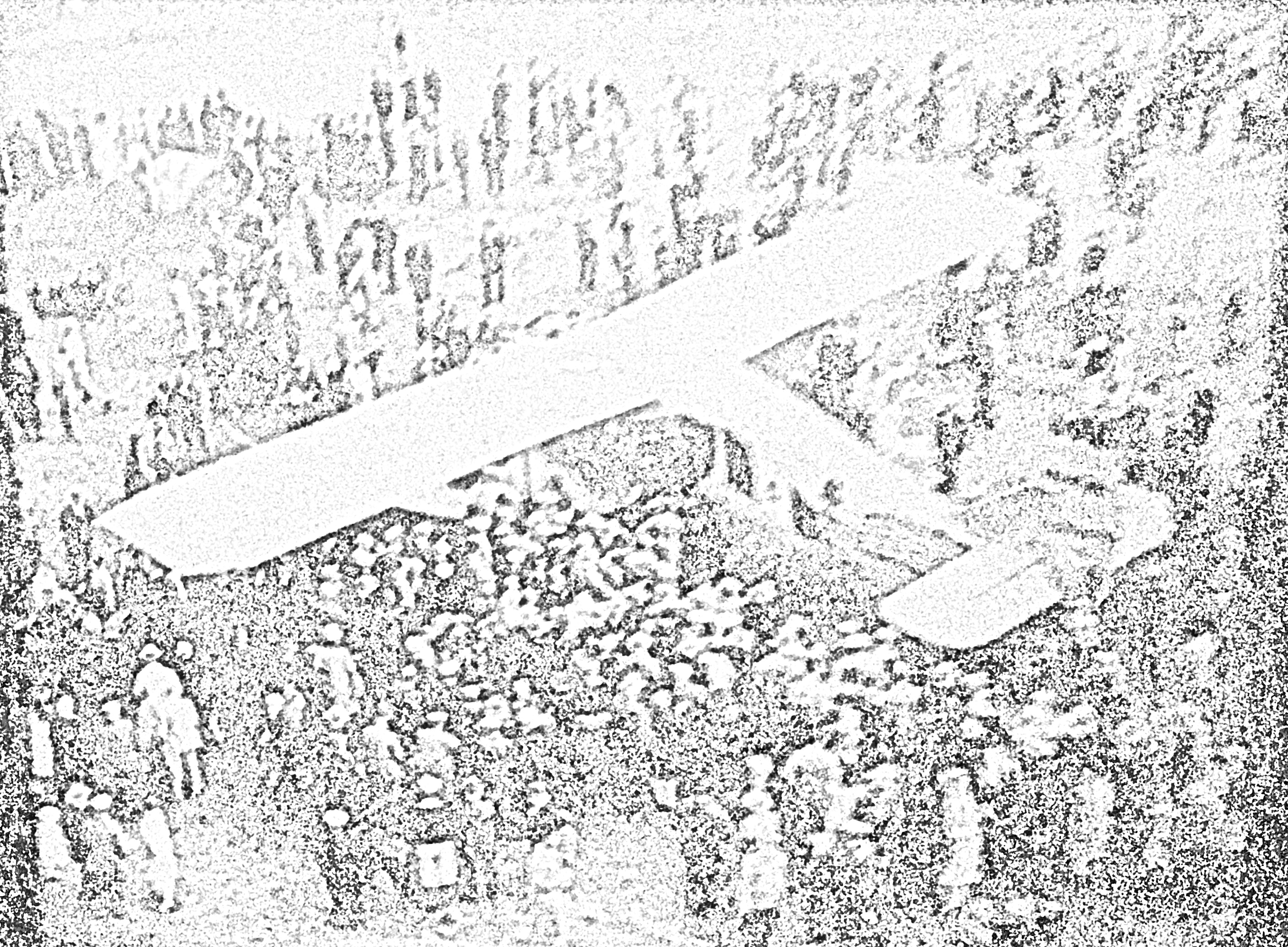 But the picture that I wanted to steal had nothing to do with drunken engagements. It was a black and white of an airplane, an old mid century high wing. Cessna-ish, something like a Super Cub or a Skywagon. The particulars of the model were not important but what was important was that the photo was taken from a high angle on a hill above a grassy area, where the plane was sitting calmly, surrounded by like five hundred people. 500. The wings and the fuselage were completely enveloped by the swarm. It looked like the plane was crowd surfing above them, like on the nature docs when you see an army of ants carrying a big leaf. I had so many questions.